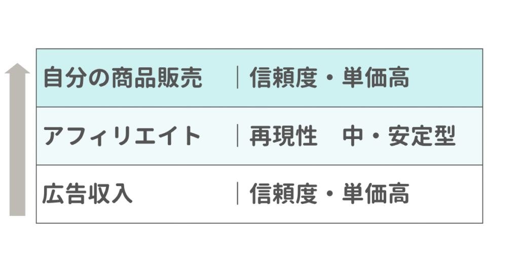 最終的にこの3つの柱を活用すれば、「PV型 × 信頼型 × ブランド型」のバランスの取れた収益モデルができ、収入が安定します。