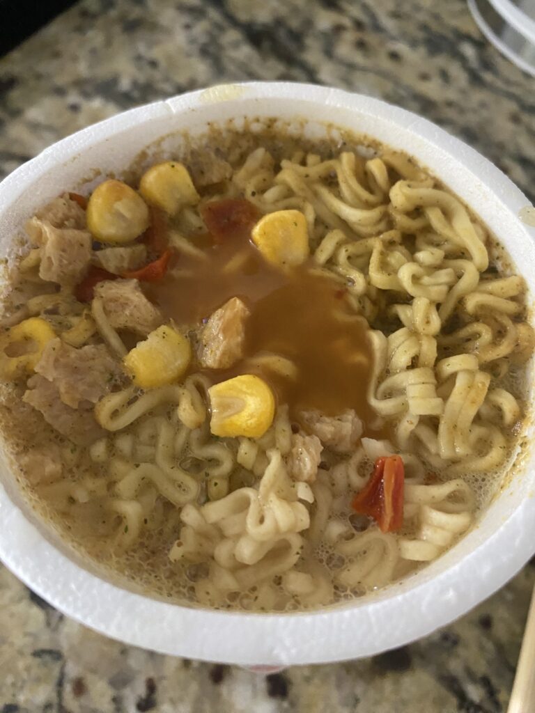 チキンは謎肉感はなくて、普通に胸肉を乾燥させた感じ。麺は、ひと昔前の日清カップヌードルの麺のような軽さ。今の日本のカップヌードルの麺は、もう少ししっかりしている気がします。
