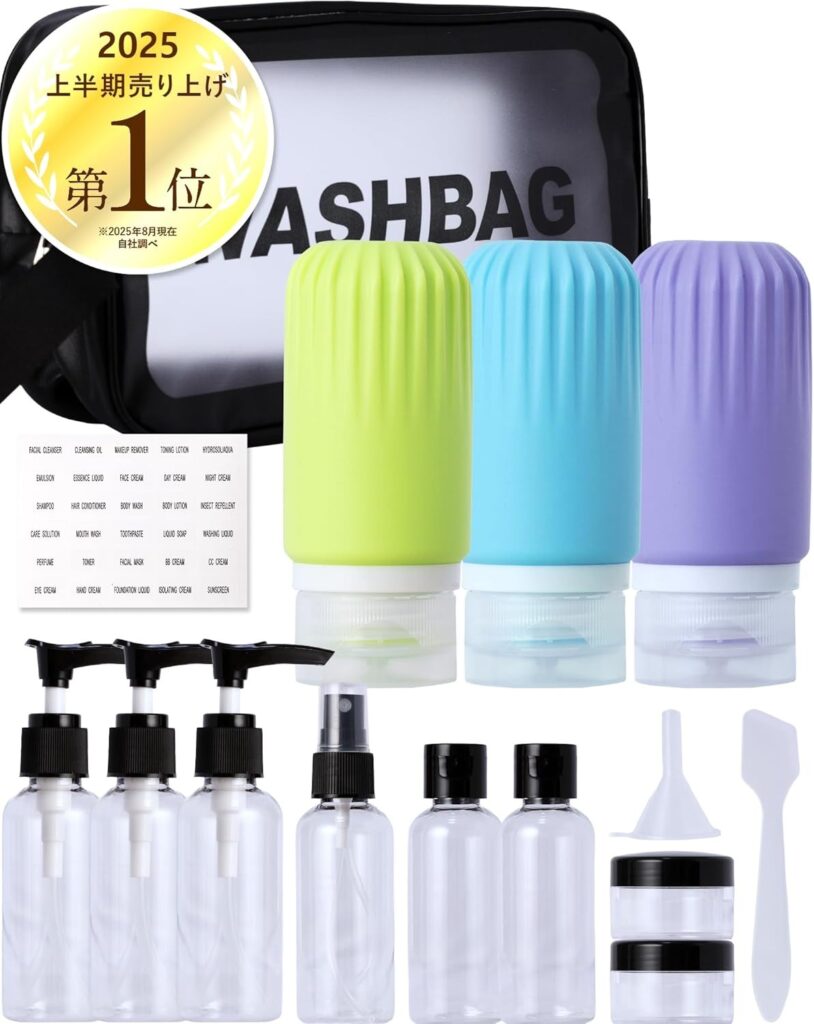 海外で人気なのが、こちらのトラベルボトルセット。漏れないと評判です。持ち運びたい液体の種類に合わせ利用したい容器を選べ、1セット持っていると重宝します。