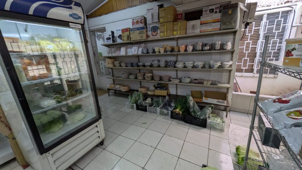 お店は、以前家だった場所をそのまま利用していて、入ってすぐの空間にに米や調味料、パンなどが並びます。2つ目の部屋には野菜と冷凍食品、そしてアジア食器。